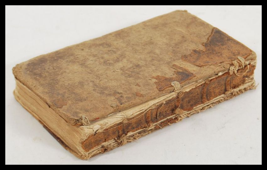 An 18th Century edition of Aesop's Fables having a Dedication to George Sunbury dated 1722 by S Croxhall illustrated with multiple woodblock prints, originally leatherbound. Measures 18cm high x 11cm wide.