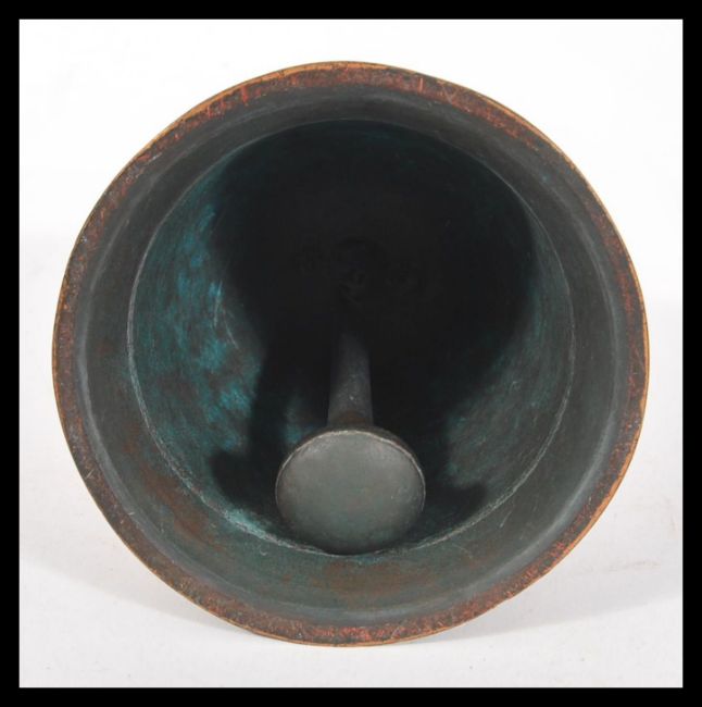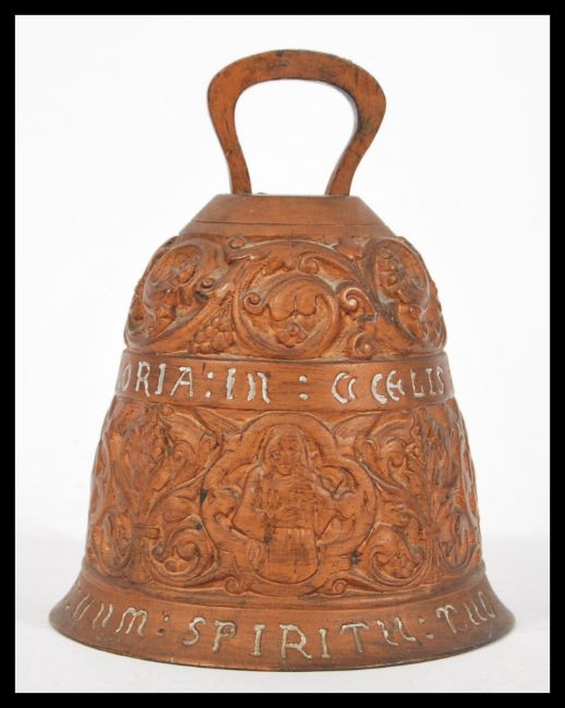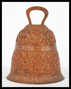 A 20th Century recreation of a 17th Century cast brass sanctuary bell with Latin inscription 'dominus vobiscum et cum spiritu tu' and decorated with Angel musicians and scrolled acanthus leaves.