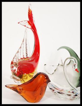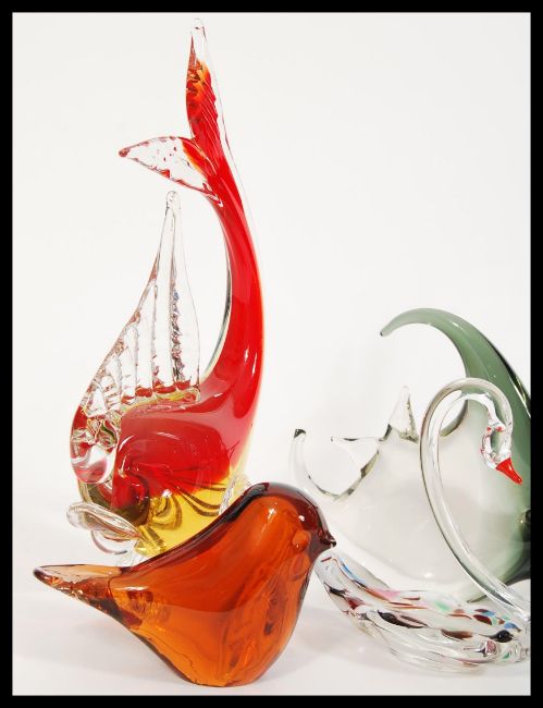 A collection of retro 20th Century studio glass figurines to include two angel fish, a swan, two paperweights in the form of birds, a sitting horse and a red glass fish. Tallest measures 25cm high