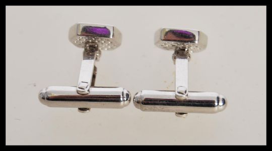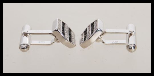A pair of stamped 925 silver hexagonal cufflinks set with rows of cz's and sapphires. Weight 8.1g.