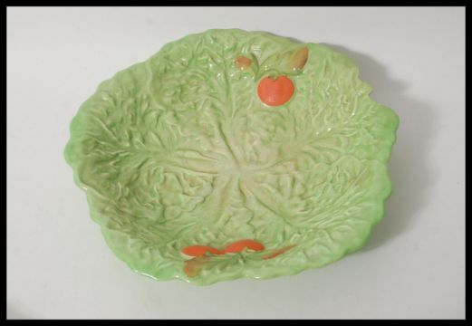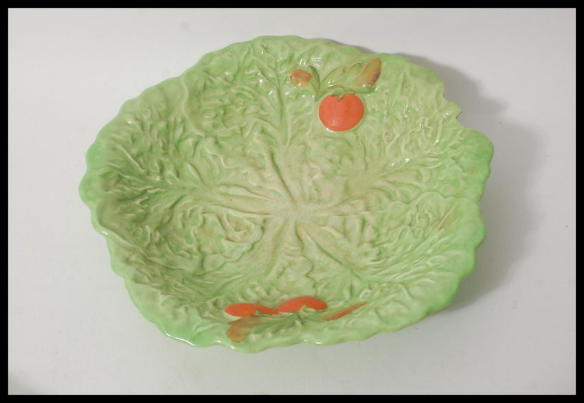 A selection of vintage 1960's Carlton Ware cabbage plates to include a nut bowl in the form of a leaf with two applied walnut and brazil nuts in relief, a selection of serving dishes having applied crabs in relief, a selection of bowls having raised tomatoes and a rectangular serving dish decorated with crabs and lobsters.