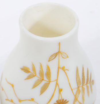 A pair of 19th Century Victorian opaline glass milk glass vases having hand gilded decoration depicting flowers and leaves. Painted numbers to bases.