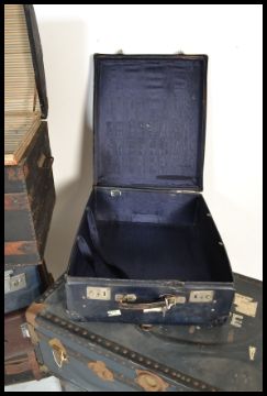A collection of 20th century steamer trunks and suitcases dating to the early and middle part of the 20th century including many sizes and colours along with a canvas and wooden bound Victorian dome top trunk. Measures 24 cm high x 90 cm wide x 51 cm deep.