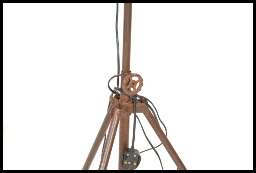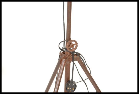 A vintage industrial floor standing adjustable spot light, raised on a metal tubular tripod frame. Measures 100 cm high.