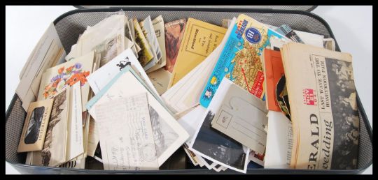 Old suitcase full of assorted ephemera items: paperwork, photos, publications - a diverse assortment.