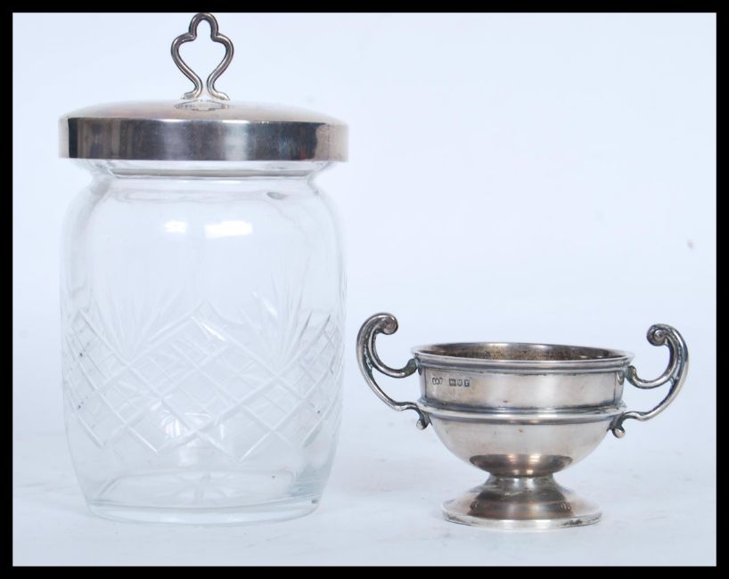 A silver hallmarked Henry Symes Shorland Fooks table salt bowl raised on a circular base with twin handles (hallmarked London 1912) along with a J Sherwood & Sons cut glass silver lidded condiment jar (hallmarked Birmingham 1900). Silver weight 62.5g. Highest measures 13 cm high x 7 cm diameter