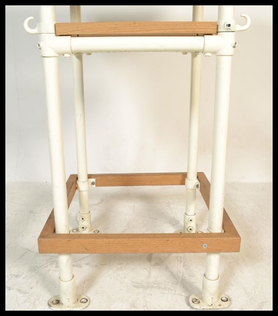 A large contemporary bistro / bar poser table constructed from reclaimed materials, heavy inset marble top with oak surround raised on upcycled scaffolding poles united by stretchers. Measures 121 cm high x 90 cm wide x 90 cm deep.