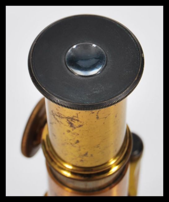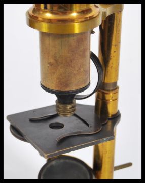 A 19th Century Victorian brass microscope on circular swivel base complete in original box with JD Williams and Son Merthyr label to interior.
