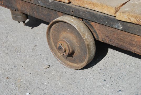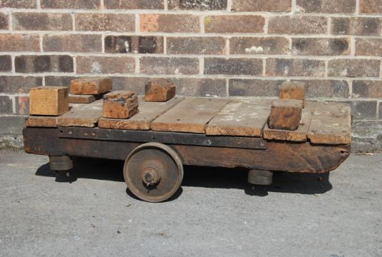 An antique vintage industrial oak based wooden cart mill dolly trolley removed from a leather factory in Northampton. Originally used to move goods, leathers or dyes. The cart being of simple wooden construction set to a metal trolley with slatted top.