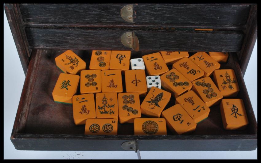 An early 20th Century Chinese Mahjong game set complete in lacquered box with drawers and lift up door. The pieces of bakelite construction with fishbone gaming pieces. Measures 17cm high x 25cm wide.