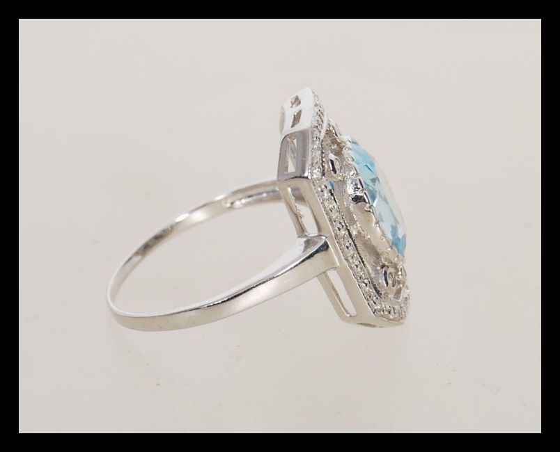 A stamped 925 silver panel ring set with a large oval cut topaz set with cz accent stones to the rectangular pierced decoration panel. Weight 2.5g. Size N.