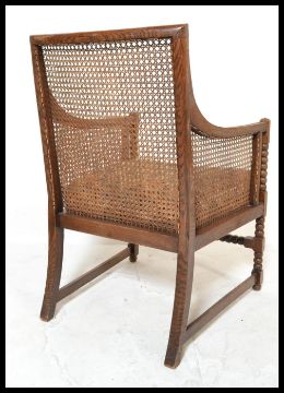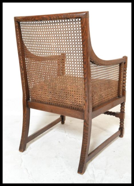 A 1930's Art Deco mahogany Bergere Armchair originally retailed by PE Gane of Bristol ( label underside ) The chair with turned legs supporting caned gallery arms and back rest with cushion to centre. Measures 93 cm high x 60 cm wide x 60 cm deep.