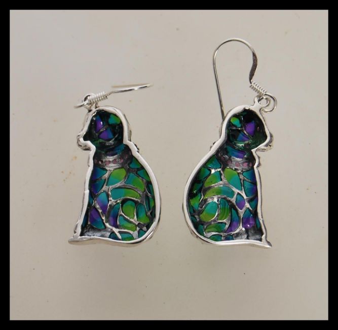 A pair of stamped 925 silver plique a jour earrings in the form of cats having ruby accent stones set to the collars. Weight 6.9g. Drops measure 3cm.
