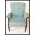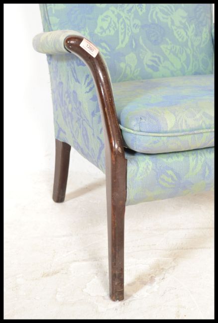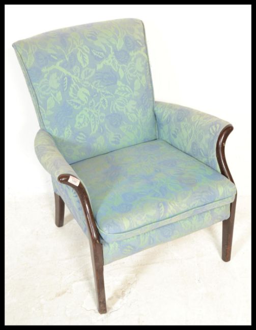 A 20th Century retro Parker Knoll fireside / lounge armchair, dark wood show frame raised on tapering supports, upholstered in a blue floral patterned fabric. Measures 80cm high x 66cm width x 60cm deep.