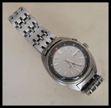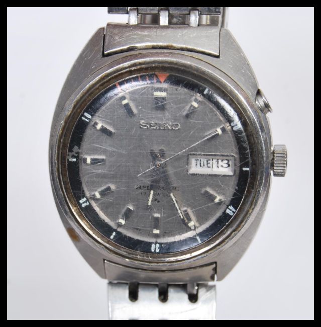 A 20th Century Seiko Bell-Matic ( Bell Matic Bellmatic ) gentleman's stainless steel automatic calendar wristwatch. The seventeen jewel watch having a silvered dial with applied batton numerales and faceted hands, day and date aperture to three. Model number 4006-6011 made in japan and being water resistant, fitted with original Seiko a stainless steel strap with deployment clasp.  Face measures 34 mm diameter.