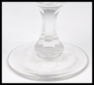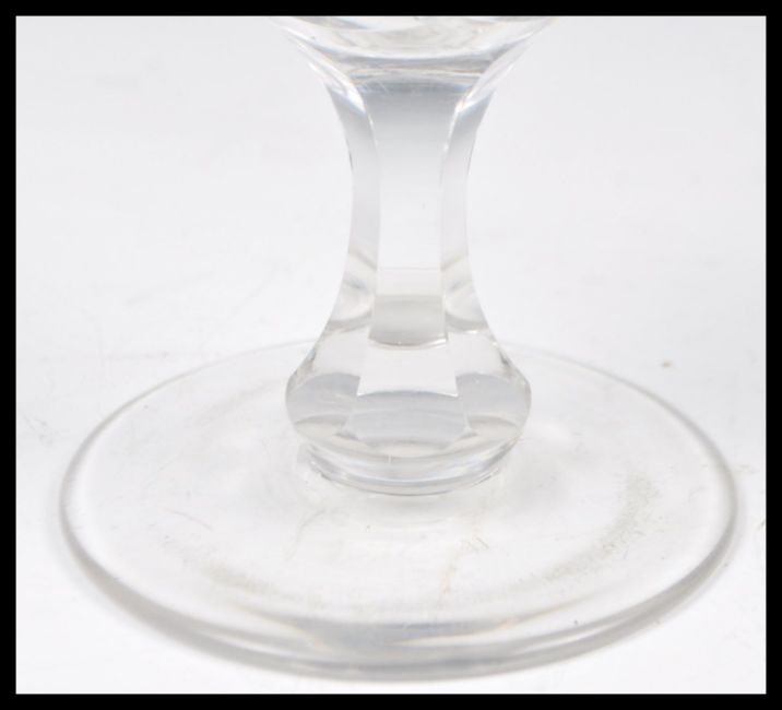 A large 19th Century faceted glass wine glass of tall form raised on a circular foot with faceted stem. The bowl having rows of large circular facets. Measures 18cm high 9cm diameter