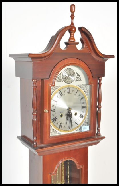 A contemporary 20th Century reproduction mahogany long case clock, stepped arch hood, gilt dial with silvered Roman chapter ring, plate 'Tempus Fugit', triple weight driven movement. Measures 184 cm high.