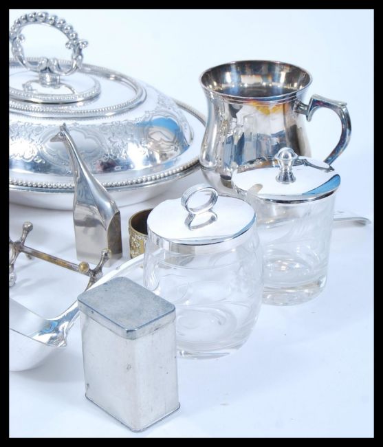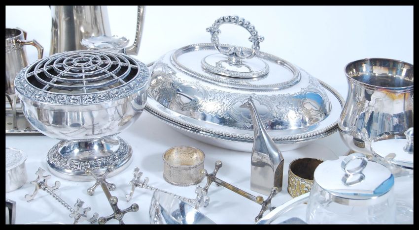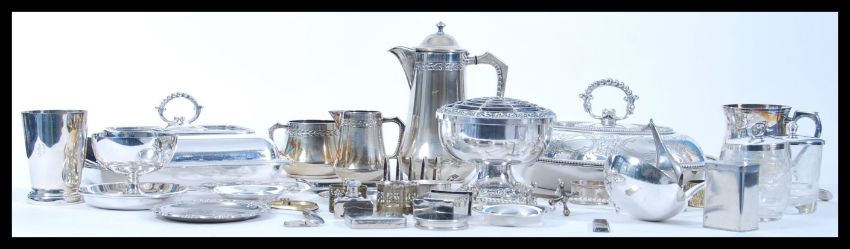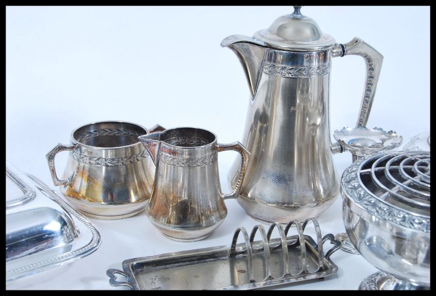 A large collection of silver plate items to include a coffee pot with matching creamer and sugar bowl, serving dishes, a spill vase, ladle, trinket dishes, tankards etc.