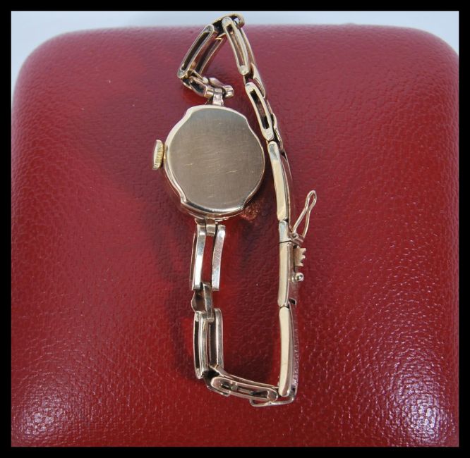 A vintage 20th Century 9ct gold ladies cocktail watch set to a 9ct gold strap. The silvered dial having gilt bato numerals and faceted hands. Complete in original red Omega style watch box and originally retailed by Kemp Brothers Bristol. Weighs 10.2 grams. Measures 14 mm x 14 mm.