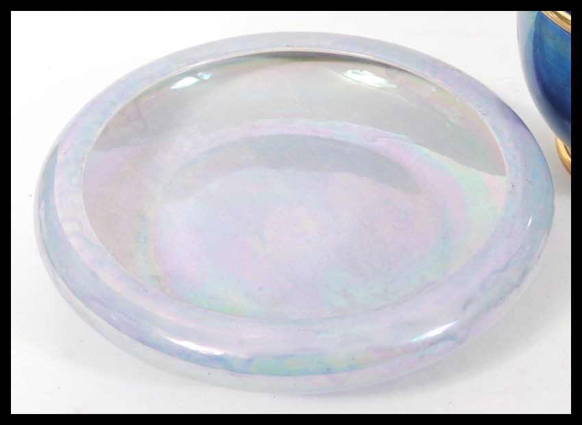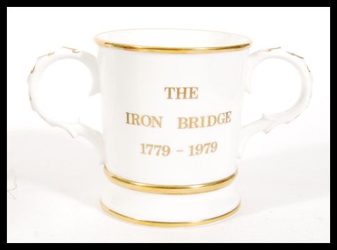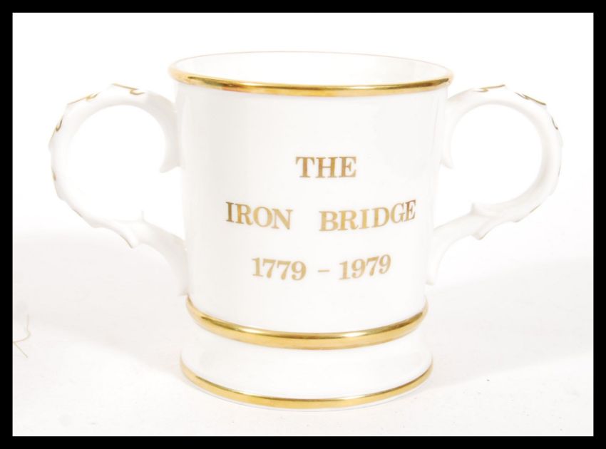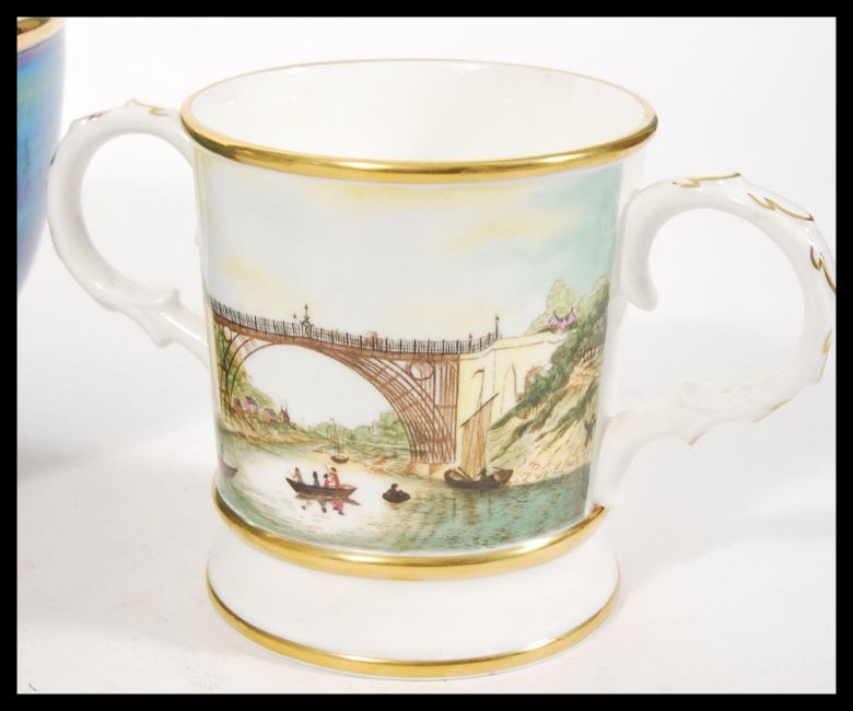 A 20th century Devon Lustre Fieldings centrepiece bowl with lilac colouration along with a dark blue Tobias Harrison lustre bowl having gilt to the rim and the base and a Coalport commemorative loving cup for the Iron bridge. Measures 14cm high 22cm wide.