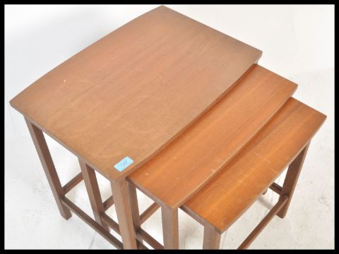 A vintage retro 20th Century teak wood nest of tables. The graduating nest of three tables raised on shaped supports. Measures 51 cm High x 56 cm Wide and 40 cm Deep.