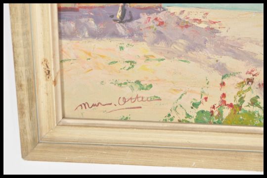 A 20th Century oil painting on canvas depicting a mediterranean scene of a boat sailing in front of a village with a blossoming tree. Signed M W Cottee to the lower left corner, set within a white frame. Measures 50 cm x 69 cm.