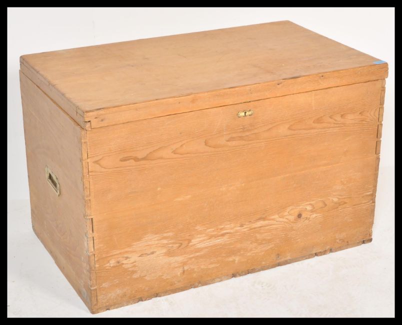 A 19th Century Victorian scrubbed pine blanket box chest of large proportions having a hinged top with carry handles to the side.