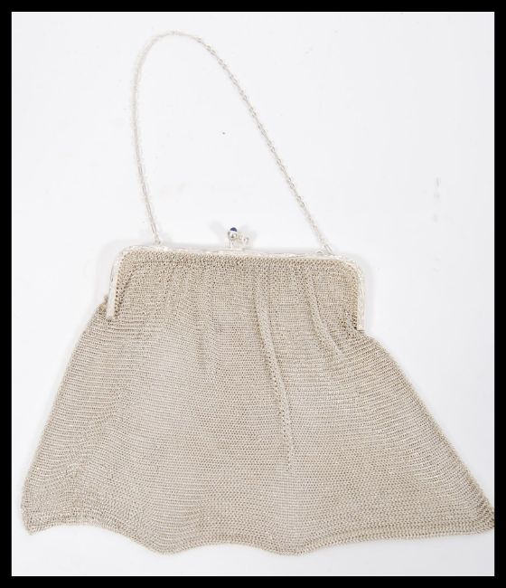 A 20th Century vintage stamped 925 silver mesh purse having a hinged clasp to the top with scrolled engraved decoration set with two blue stones and having a chain strap attached. Weight 131.1g. Measures 28 cm long x 18 cm wide.