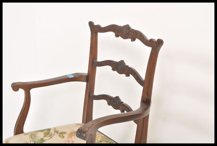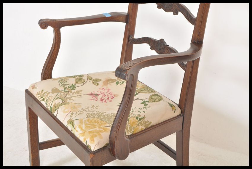 A late 19th Century Victorian Chippendale Revival mahogany childs childrens carver armchair ( dining chair  )  raised on block legs with H stretcher. The chair having drop in seat with carved scroll arms and acanthus leaf ladder back. Measures 82 cm high x 47 cm wide x 40 cm deep.