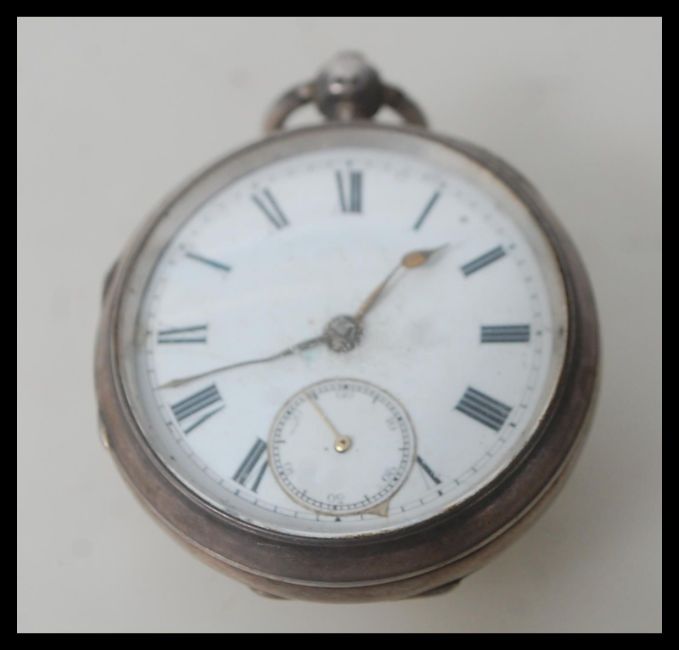 An early 20th Century hallmarked silver Chester pocket watch having a white enamel face with Roman numeral chapter ring with faceted hands.