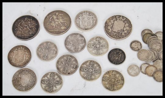 A selection of silver coins mostly dating from the Victorian era to include an 1899 half crown, a shield back crown with a young head facing left (date rubbed), two 1880 silver crowns with George and the Dragon, two 1887 silver florins, a Georgian 1824 Georgian shilling, four early 20th Century silver florins and a selection of maundy money.