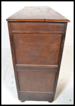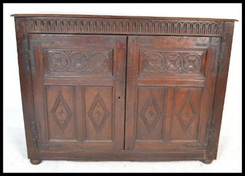 An 18th / 19th century carved oak Jacobean revival livery cupboard of large form. The wide and tall body with twin door cupboards having fielded panels  with carved lozenge detailing, carved dentil beneath flared top above. Measures 117 cm high x 150 cm wide x 52 cm deep.
