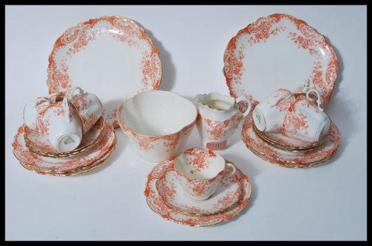 An early 20th Century tea service by Aynsley having a printed scrolled and floral orange pattern, with gilt rims to include tea cups and saucers, plates etc. Rd No. 291231.