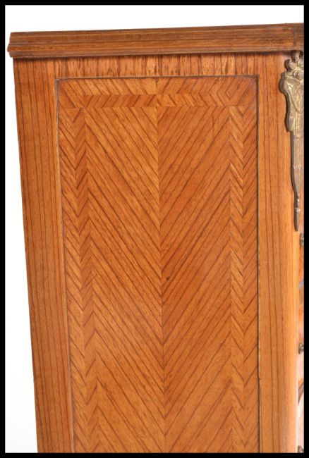A 20th Century Continental French king wood seven day chest of drawers having ormolu mounts with turned brass handles. The bank of seven drawers having herringbone decoration.
