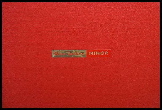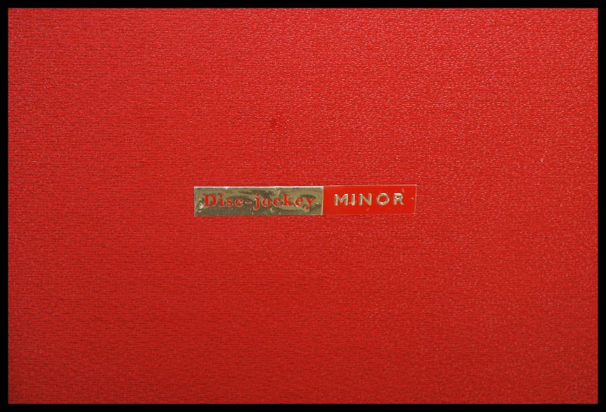 A vintage retro 20th Century Philips portable record player having a two tone vinyl case. The Disc Jockey Minor having grille and dials to front. Measures 16 cm high x 36 cm wide x 38 cm deep.