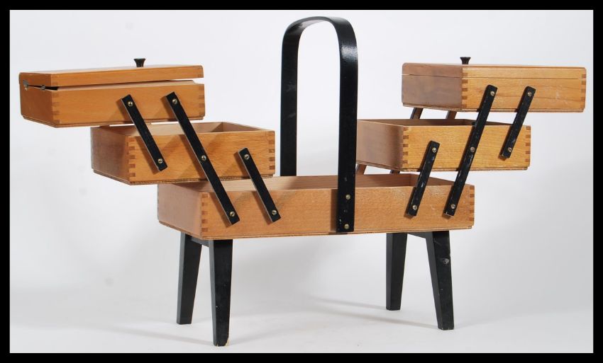 A vintage retro 20th Century beech wood work / sewing box with a concertina action, ebonised carry handle to the top raised on ebonised splayed legs.