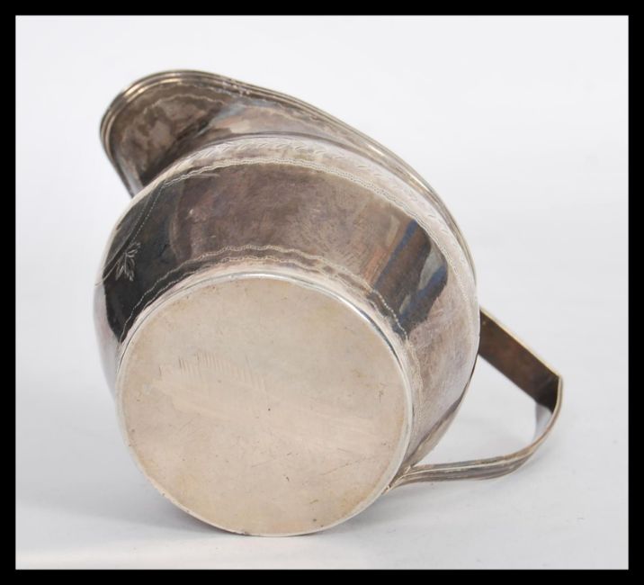 An early 19th Century Georgian hallmarked silver creamer jug having shaped handle. Hallmarked for London 1802. Weighs 76.2 grams. Measures 8cm high x 10cm wide.