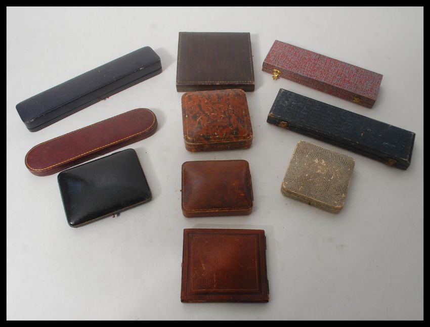 A collection of ten vintage hinged jewellery boxes to include watch boxes, necklace boxes etc. Many leather examples.
