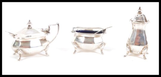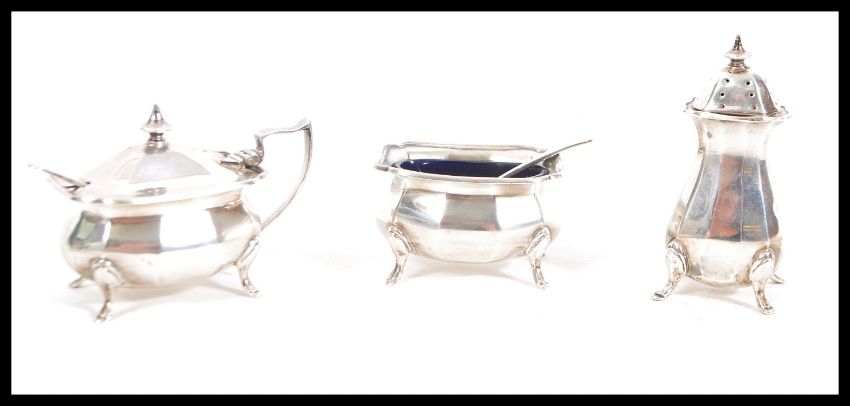 A matching set of three early 20th Century hallmarked silver condiments by Alexander Clark & Co Ltd consisting of a tall pepperette, open salt cellar and lidded mustard pot both having blue glass liners. Hallmarked for Birmingham 1923. Along with two condiment spoons also hallmarked. Weighs 155.5 grams. Tallest measures 8cm high.