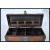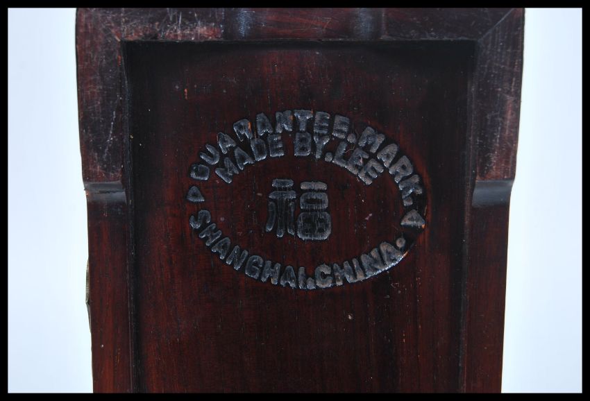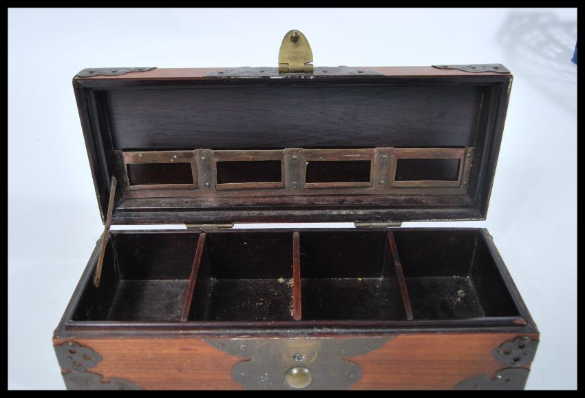A 19th Century Chinese wooden and brass bound box having large armorial brass mounts with central medallion. Hinged lid opens to reveal fitted sectional interior.