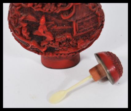 A 19th Century Chinese Cinnabar lacquer snuff bottle of moon flask shape having decoration depicting figures in the Canton style.