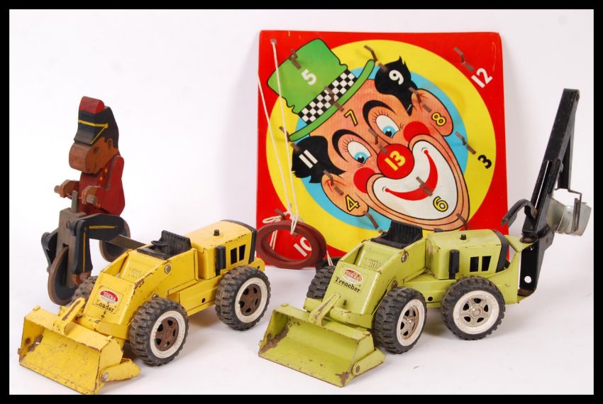A collection of 4x assorted vintage toys to include; tin clown hook the loop game, painted wooden soldier on a bike, Tonka trencher tin plate toy and a Tonka Loader tin plate toy.