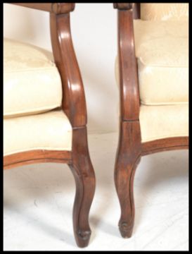 A pair of 20th Century Contemporary French style armchairs. The chairs having mahogany show wood frames being upholstered in yellow velour fabric. Measures 104 cm high x 68 cm wide x 60 cm deep.