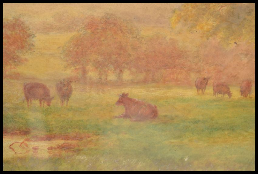 A 19th Century watercolour painting depicting highland cattle and landscape set to an ornate gilt frame. Signed to lower right corner. Glazed