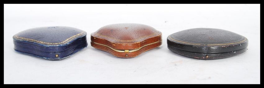 A group of three vintage leather bracelet jewellery boxes of teardrop / pear form, clasps fitted to hinged boxes