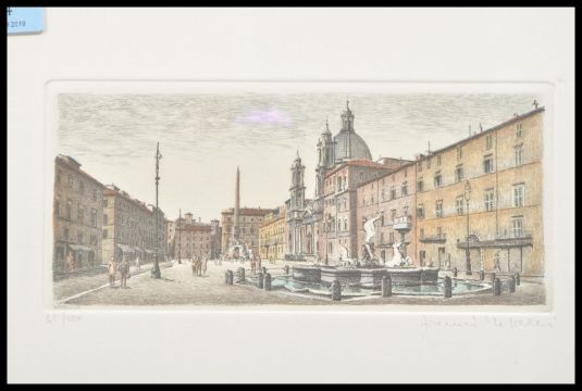 A 20th Century etching on paper by Gianni Raffaelli depicting PIazza Navona in Rome, hand coloured with yellow and brown hues, set within a walnut veneer frame. Signed to the corner. Measures 9 cm high x 20 cm wide