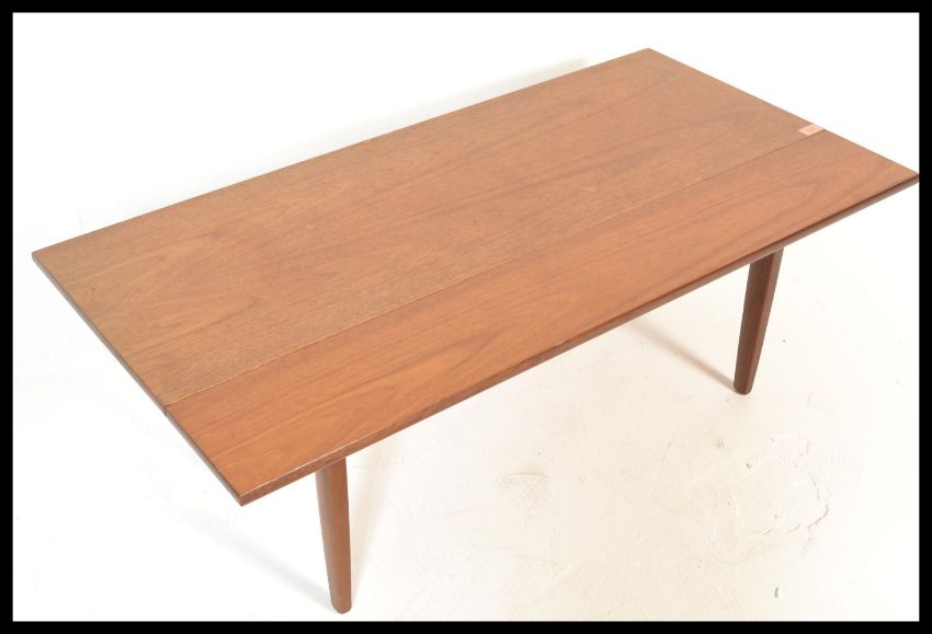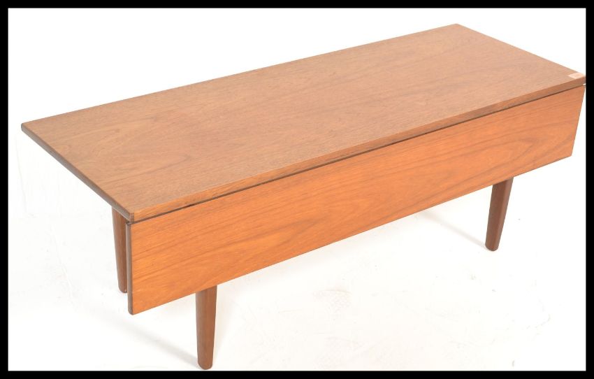 A retro 20th Century teak wood gate leg flap extendable coffee table, single leaf raised on tapering shaped supports. Measures 41cm high x 114cm width x 58cm deep.