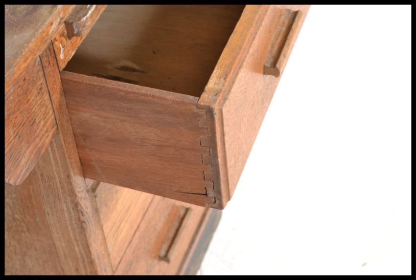 A retro 20th Century Air Ministry style oak single pedestal desk having a straight pedestal of three drawers under pull out skiver, raised on an ebonised plinth base. Measures 77 cm high x 122 cm wide x 61 cm deep.