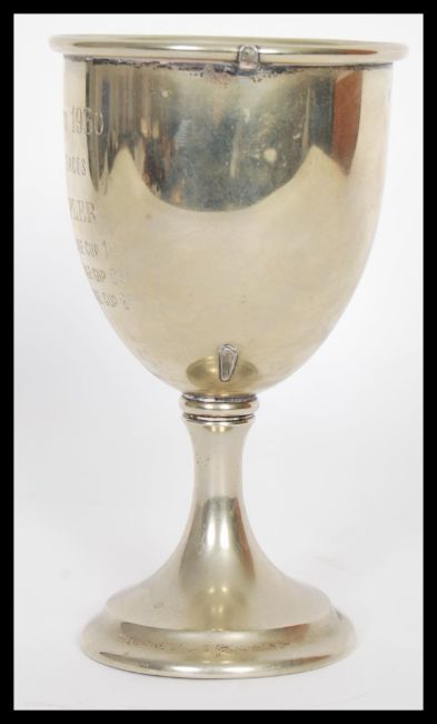 Bobsleigh interest - a rare 1930's silver plated trophy with engraved notation for a Miss Pepler Diablerets Bobsleigh Races Mappin Challenge 1st place. Measures 12.5 cm high x 7.5 cm diameter