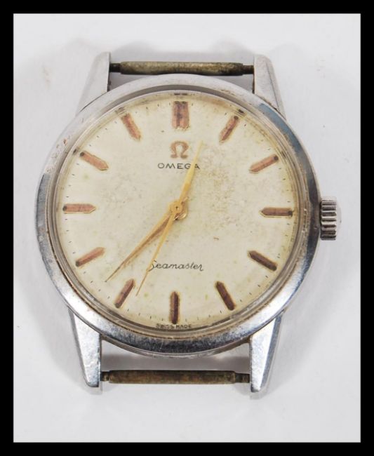 A vintage Omega Seamaster gentleman's wrist watch set within a stainless steel case with baton markings to the chapter ring and faceted hands, marked Seamaster to the back. Face measures 32 mm diameter.
